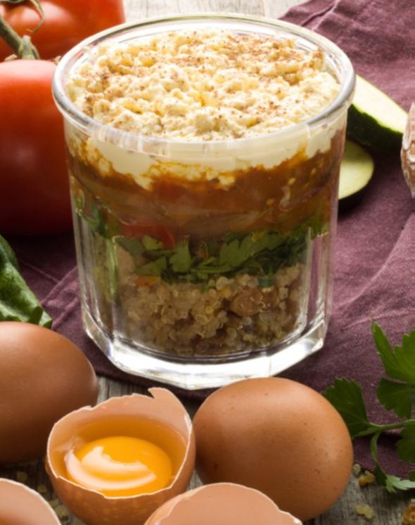 Plat : quinoa cuit dans un bouillon de légumes aux agrumes, raisins secs, ratatouille et brouillade d’œufs issus de poules françaises élevées en plein air.