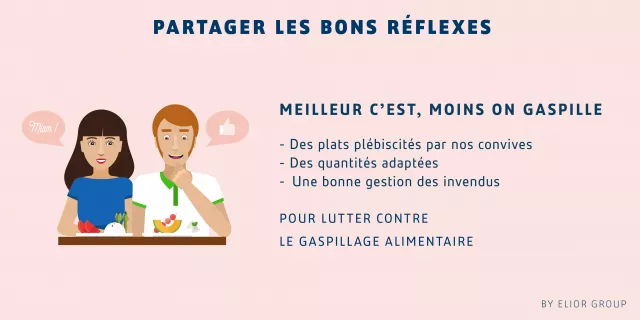 - Tous contre le gaspillage alimentaire : les restaurants du Groupe veillent à proposer des quantités justes à leurs convives et les sensibilisent à une consommation responsable. Des chasses au gaspi ludo-éducatives sont ainsi organisées en milieu scolaire pour faire visualiser aux enfants la quantité journalière de pain et d’eau gaspillée. En cinq ans, 600 000 enfants ont ainsi été sensibilisés, permettant une réduction de 20 à 30 % du gaspillage. Afin de proposer aux Parisiens d’adopter de nouveaux réflexes anti-gaspi, Elior Group a lancé en 2015, avec la Mairie de Paris et le Synhorcat, le premier doggy bag parisien. Le Groupe souhaite ainsi initier de nouvelles habitudes auprès des restaurateurs et permettre aux consommateurs d’emporter ce qu’ils n’ont pas consommé.