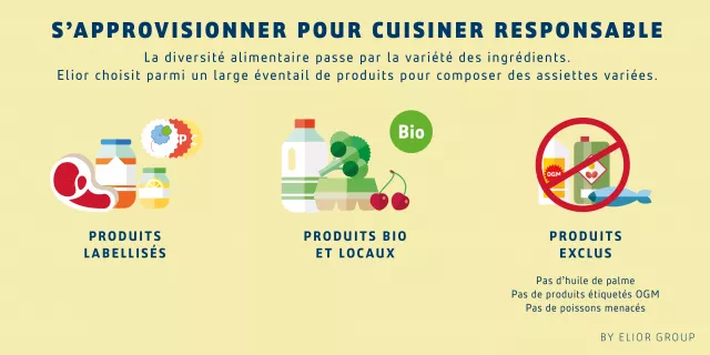 - Des produits labellisés et des produits exclus : dans le cadre de sa politique achats responsables, Elior Group préserve les ressources halieutiques. Sont interdits les approvisionnements en poissons de grands fonds (le grenadier, l’empereur…), tous les requins les plus menacés, ainsi que le thon rouge. Concernant les viandes, Elior France est partenaire depuis 2005 de l’association Bleu-Blanc-Cœur, qui favorise le bien-être animal et une agriculture responsable : 80 produits Bleu-Blanc-Cœur sont référencés. Par ailleurs, sont exclus des approvisionnements l’huile de palme et les produits étiquetés OGM.