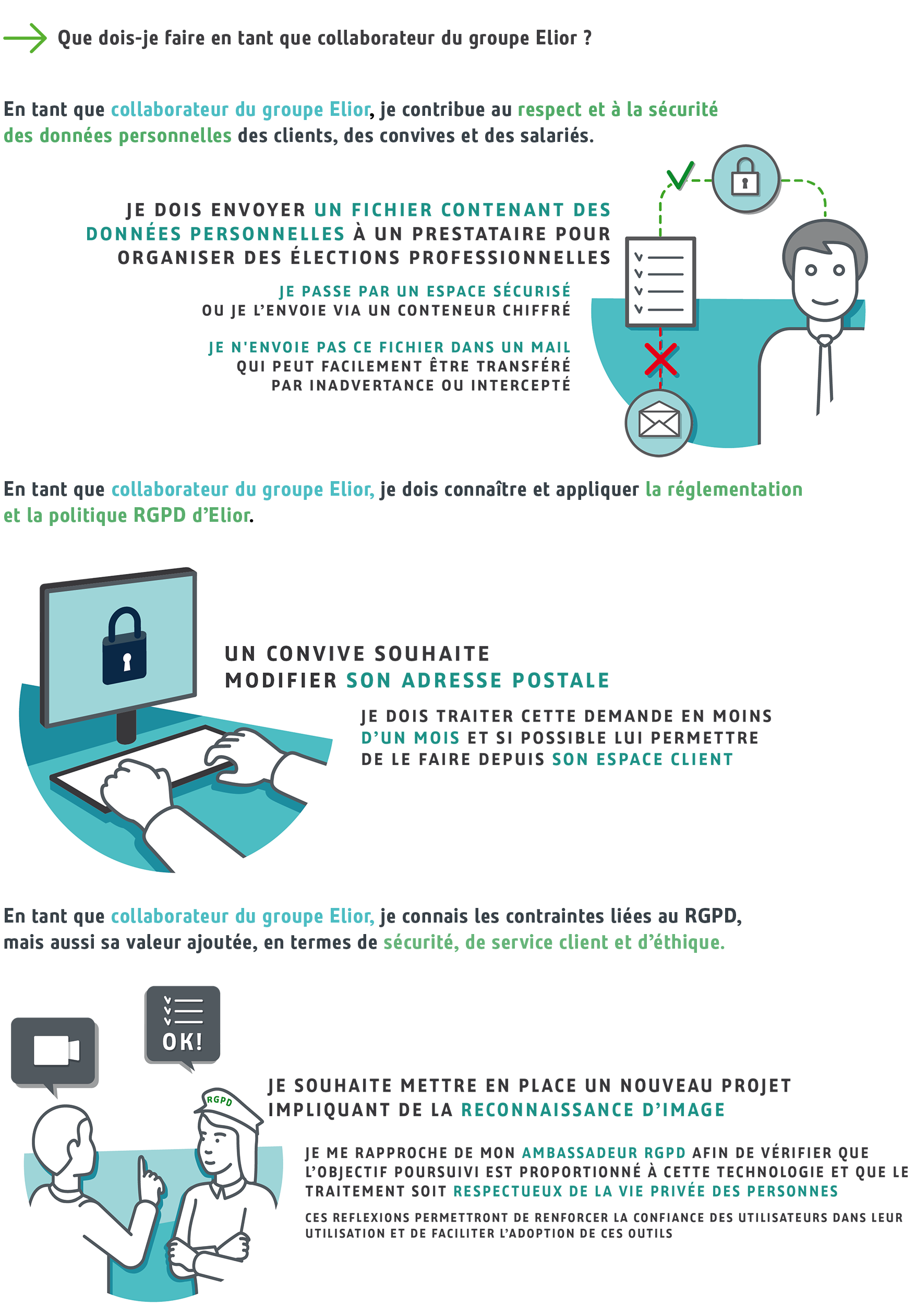 En tant que collaborateur, le groupe Elior est amené à collecter et traiter un nombre conséquent de données vous concernant. A ce titre, le groupe Elior se doit de traiter vos données de manière transparente, loyale et d’assurer leur sécurité.