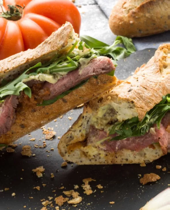 Sandwich: whole wheat bread made from Label Rouge flour, filled with French beef, rocket salad, fresh basil, crushed tomatoes and béarnaise sauce.