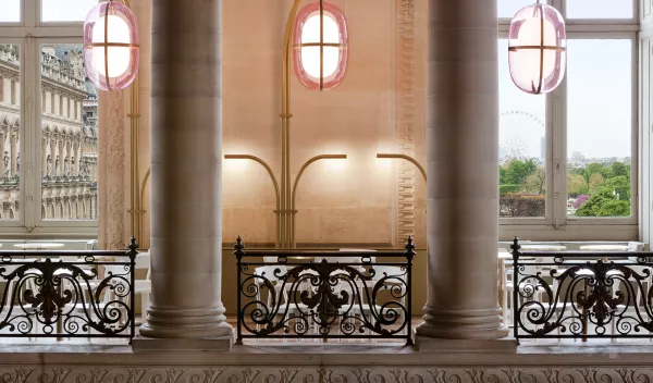 After designing the Café ArtScience in Boston, which is currently in the running for the “outstanding bar” award in the US[2], Mathieu Lehanneur went on to tackle the remodeling of the Café Mollien in the Louvre, the most prestigious monument and museum in Paris. Café Mollien comprises an L-shaped dining room and a 230 m2 terrace offering the best view of the Louvre Pyramid. Inside, 66 seats are arranged around a magnificent brushed-brass, acrylic lighting structure, with organic-like extensions stretching up to 4.5 meters high. The designer describes these as "three, large pale-pink eggs; luminous and translucent, floating in space and inhabiting the void that separates us from the ceiling, and act as a signal in the Parisian perspective.”