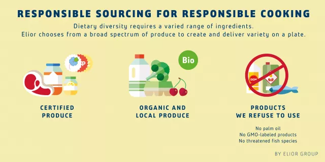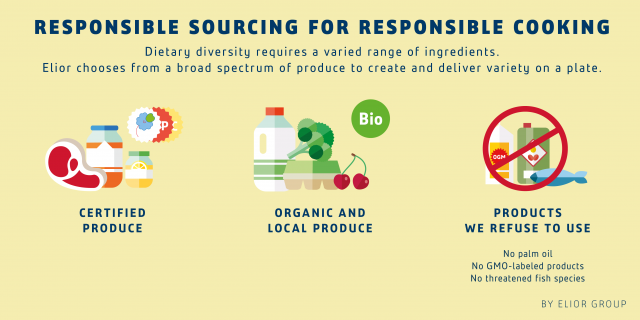 - Certified and exclusive products: within the context of its responsible purchasing policy, Elior Group is committed to preserving fish populations by refusing to source protected deep-sea species, such as grenadier and emperor fish, as well as the most endangered members of the shark family and red tuna. Concerning meat supplies, since 2005, the Group has been a partner of the Bleu-Blanc-Cœur association which promotes the well-being of animals and sustainable agriculture. Elior France currently has 80 Bleu-Blanc-Cœur meat-product references. In addition, the Group does not use palm oil or any GMO-labeled products.