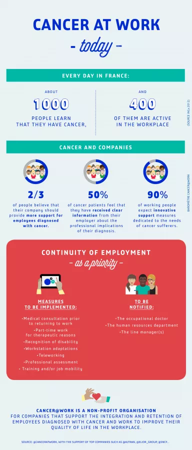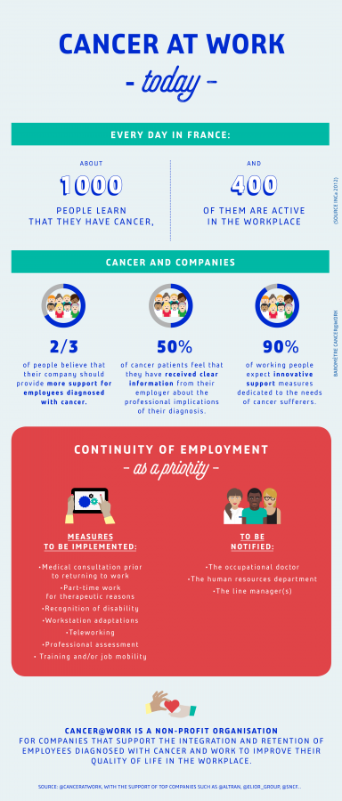 President of Cancer@Work since its creation in 2012, Chairman and Chief Executive Officer of Elior Group Philippe Salle declared: “Companies have a fundamental role to play; they must be able to adapt their way of functioning to accommodate employees suffering from the disease.” Indeed, every day in France, nearly 400 people in work are diagnosed with some form of cancer.