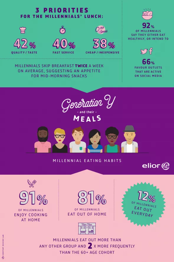 Millennials tend to shun traditional mealtimes; many skip breakfast, preferring the mid-morning snack and, for lunch, opt for easy-access, high-quality fast-food solutions.